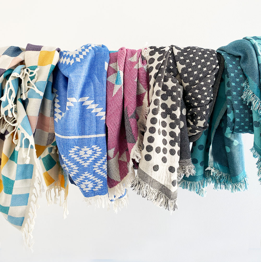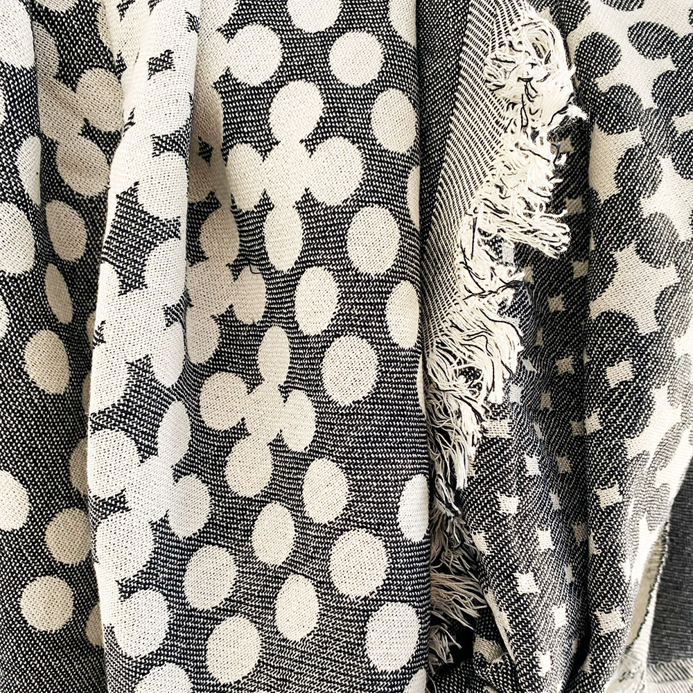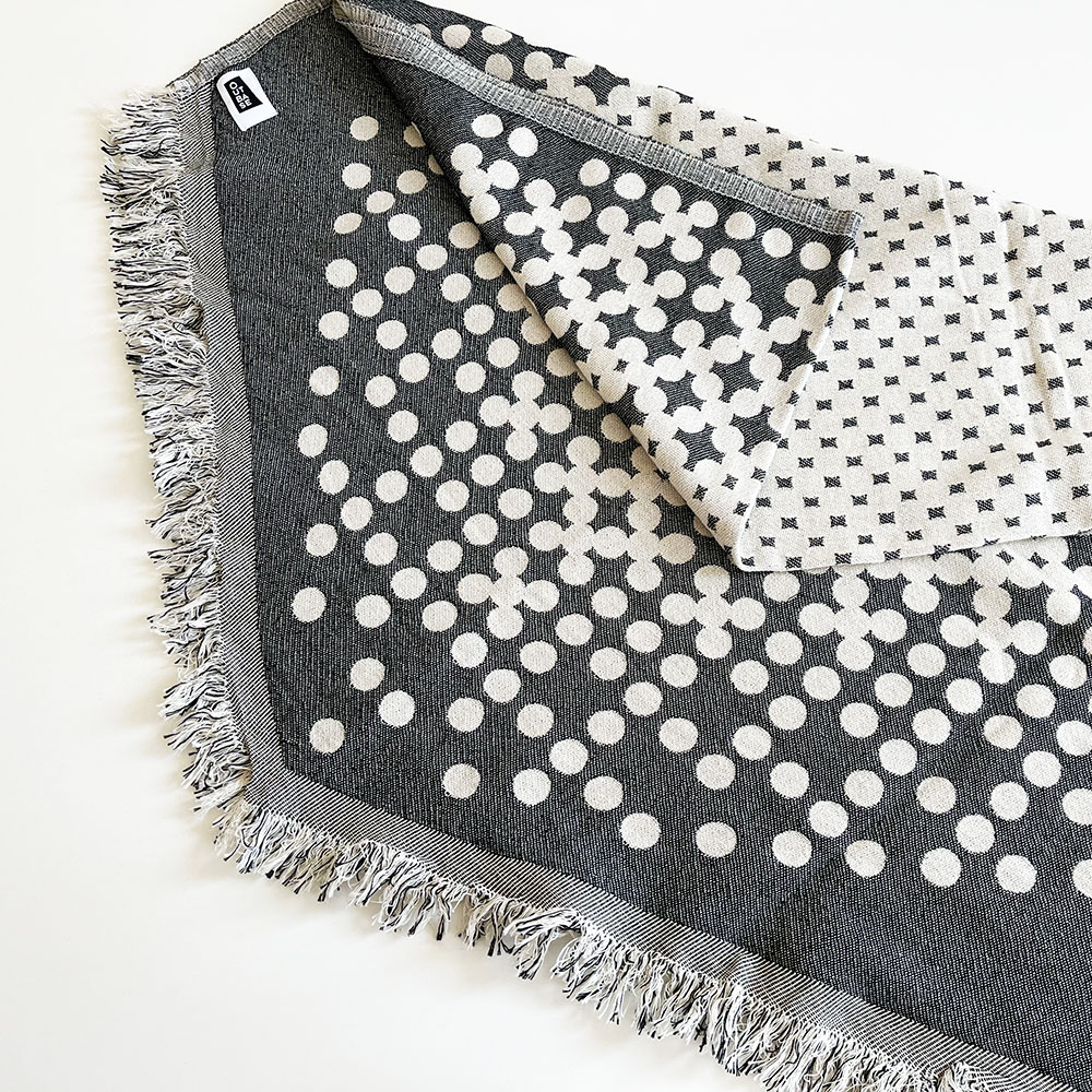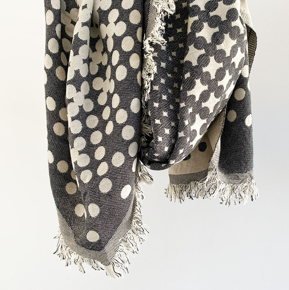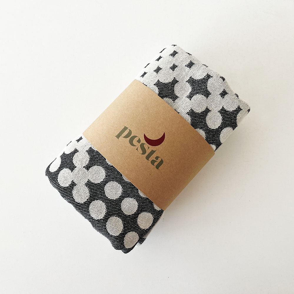 Multifunctional Peshtemal Pika in black and white color, which can be used as a cloak, summer skirt, bulky scarf, light traveling towel or a beach blanket. It has unique, pointy ends, which make more a hexagon shape the peshtemal than a classic rectangle. Made in Turkey and out of 100% cotton.
