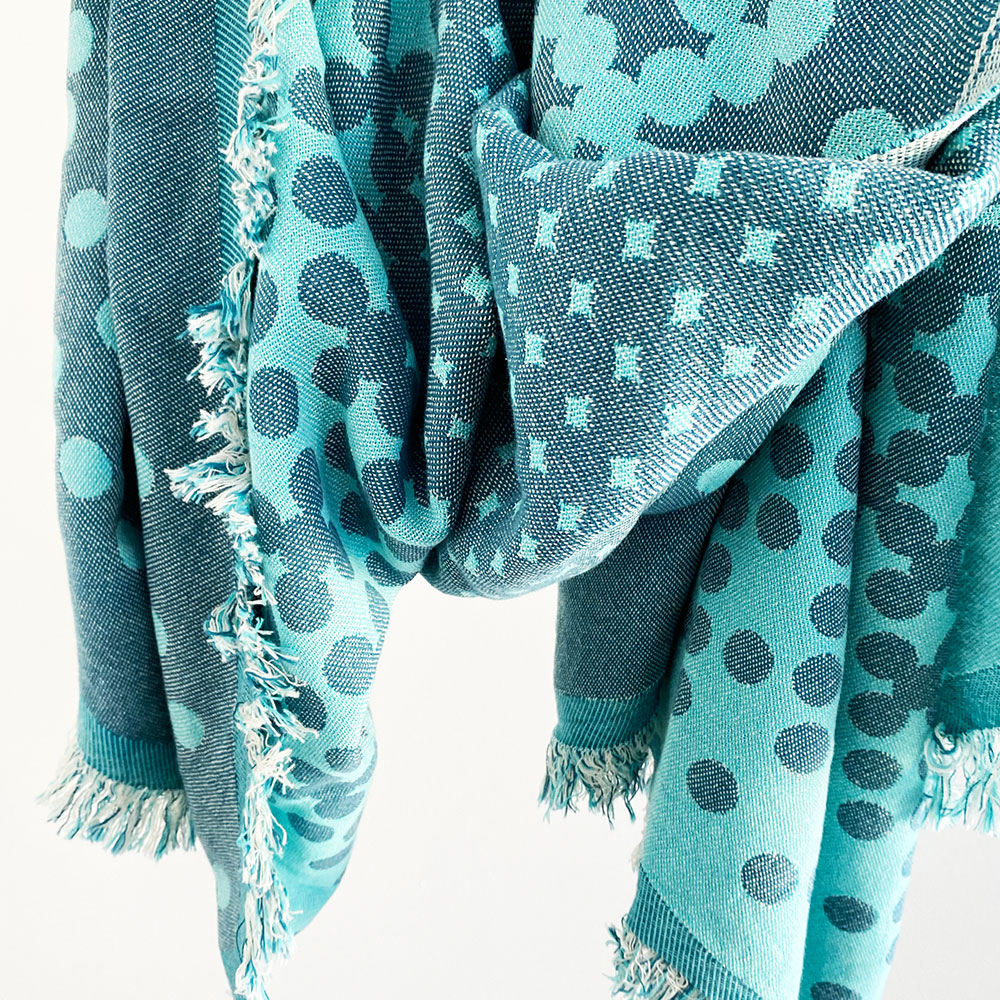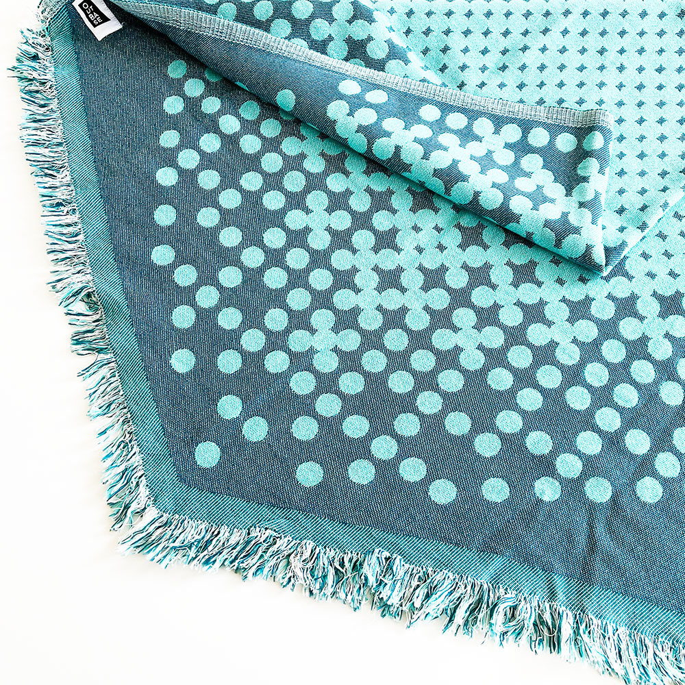 Multifunctional Peshtemal Pika in blue and turquoise color, which can be used as a cloak, summer skirt, bulky scarf, light traveling towel or a beach blanket. It has unique, pointy ends, which make more a hexagon shape of the peshtemal than a classic rectangle. Made in Turkey and out of 100% cotton.