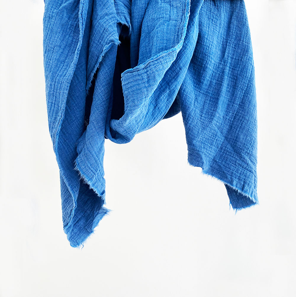 Vsestranska peštemalka Iza v sprano modri barvi, ki je lahko koristno ogrinjalo, fejst krilo, mehek šal, uporabna brisača ali podloga na plaži. Vedno mehka, lepih vzorcev in polna toplote. Narejena iz 100% naravnega bombaža.